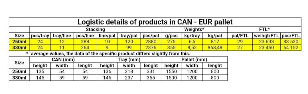 Pentru dozele de 330 ml, un tray contine tot 24 de bucati, cu 9 straturi pe palet, adica 99 de tray-uri si 2.376 de doze pe palet. In acest caz, greutatea ajunge la circa 8,52 kg pe tray si aproximativ 868 kg pe palet. Dimensiunile cansurilor, tavilor si paletilor sunt conform standardelor europene, pentru manipulare usoara in depozit si transport international.